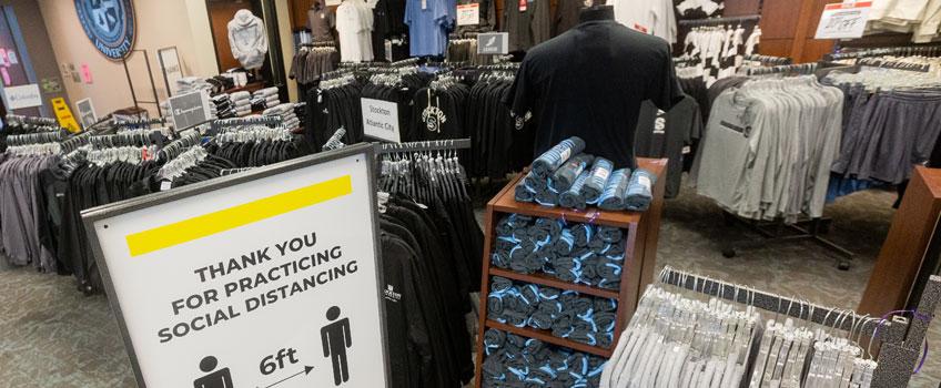 Precautions at the Campus Center Store include completing a daily COVID certification before starting their shift—attesting that they do not have a fever or any other symptoms. Staff must wear an approved mask, wash hands often, and use hand sanitizer, all while social distancing throughout the store.
