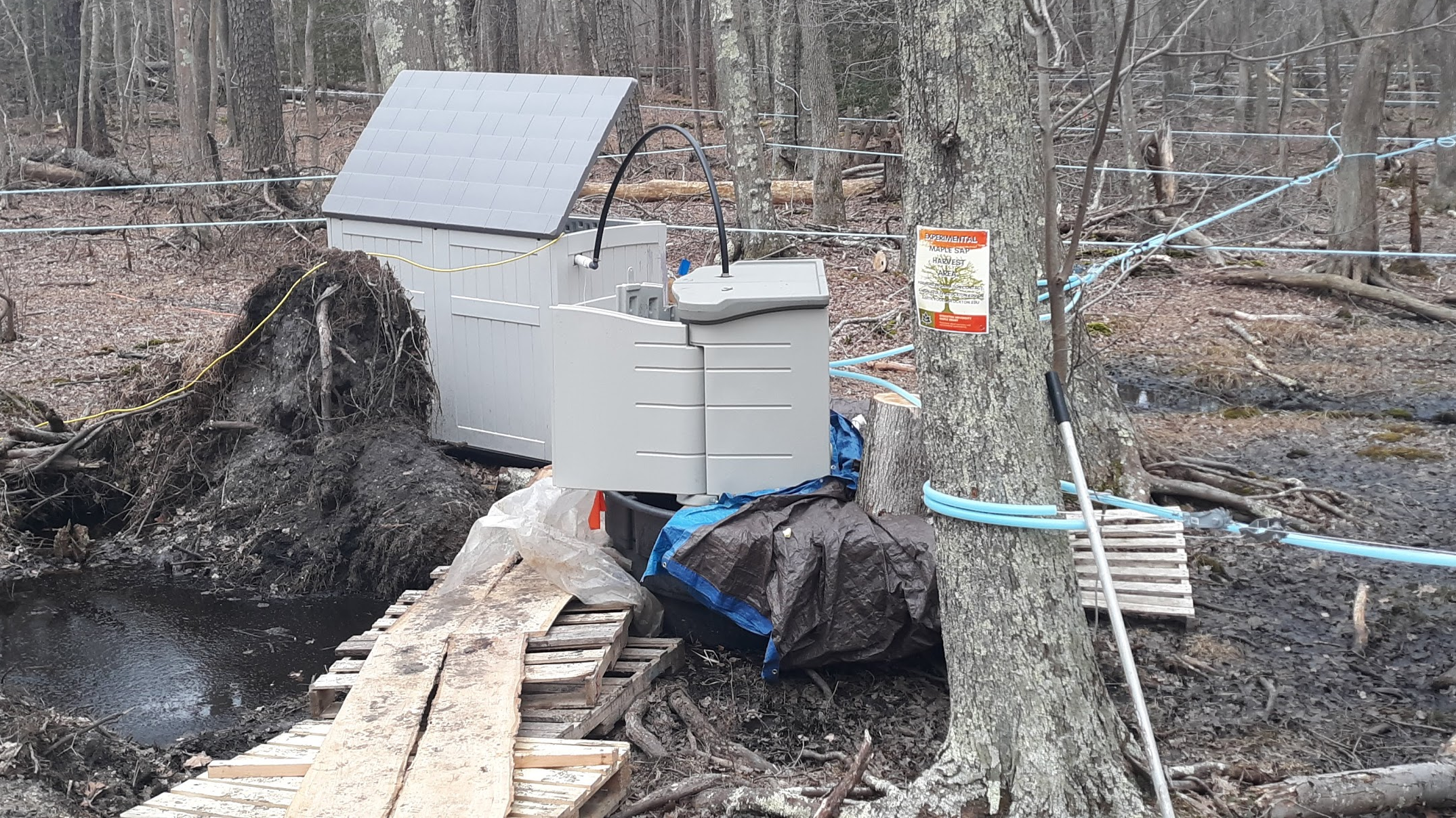 Just beyond Lot 1, one may notice a pathway that leads to blue tubed trees and a vacuum mechanism. One of the most recent research endeavors at Stockton, the Maple Grant Project is sweeter than most. This federally-funded project started in September 2019 and has been tapping the local red maple trees in the surrounding Pinelands for their sap to make maple syrup.