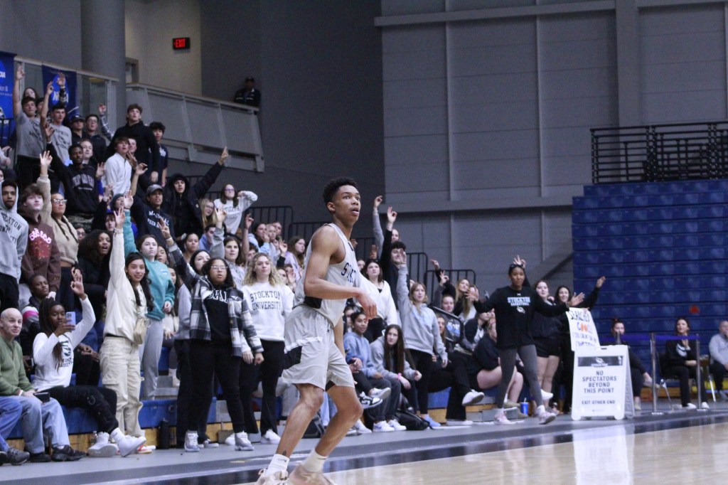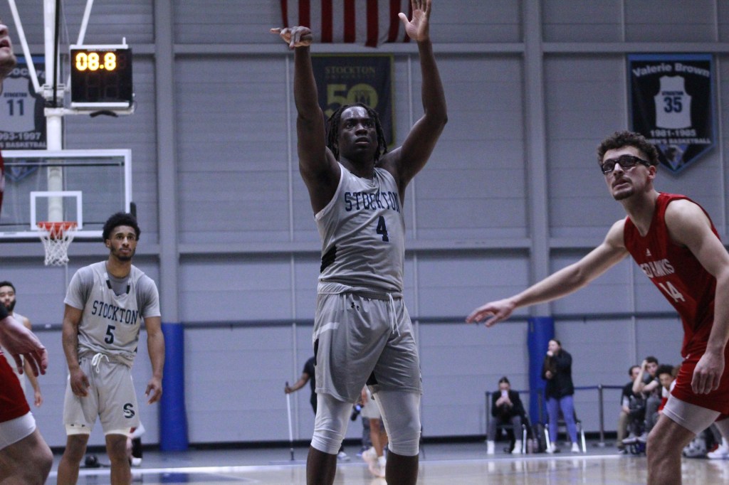 On Tuesday night, Feb. 21, Stockton Men’s Basketball hosted the NJAC Semifinal game against Montclair. The Ospreys defended their home court, beating the Red Hawks 91 to 86. The lead scorers of the match were DJ Campbell (#4) with 35 points, Kyion Flanders (#2) with 18 points, and Kadian Dawkins (#0) with 15.