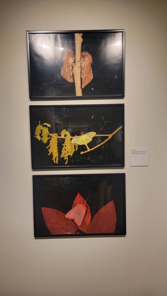 We then headed upstairs to take a look at the “A Pinelands Portrait” collection featuring a plethora of media and subjects all connecting back to our own backyard, the Pine Barrens. Ann-Marie Woods’ collection of moths caught their attention. ‘From Sallows on Huckleberry’, 2023, is a portrait of two moths; the first of the season. “I do a lot of work illustrating moths actually, so it’s really a treat to see them here. I like how they mirror one another in this specific picture. I love the detail. You can tell there was a lot of effort put into capturing this specific moment in time,” said Palencia.