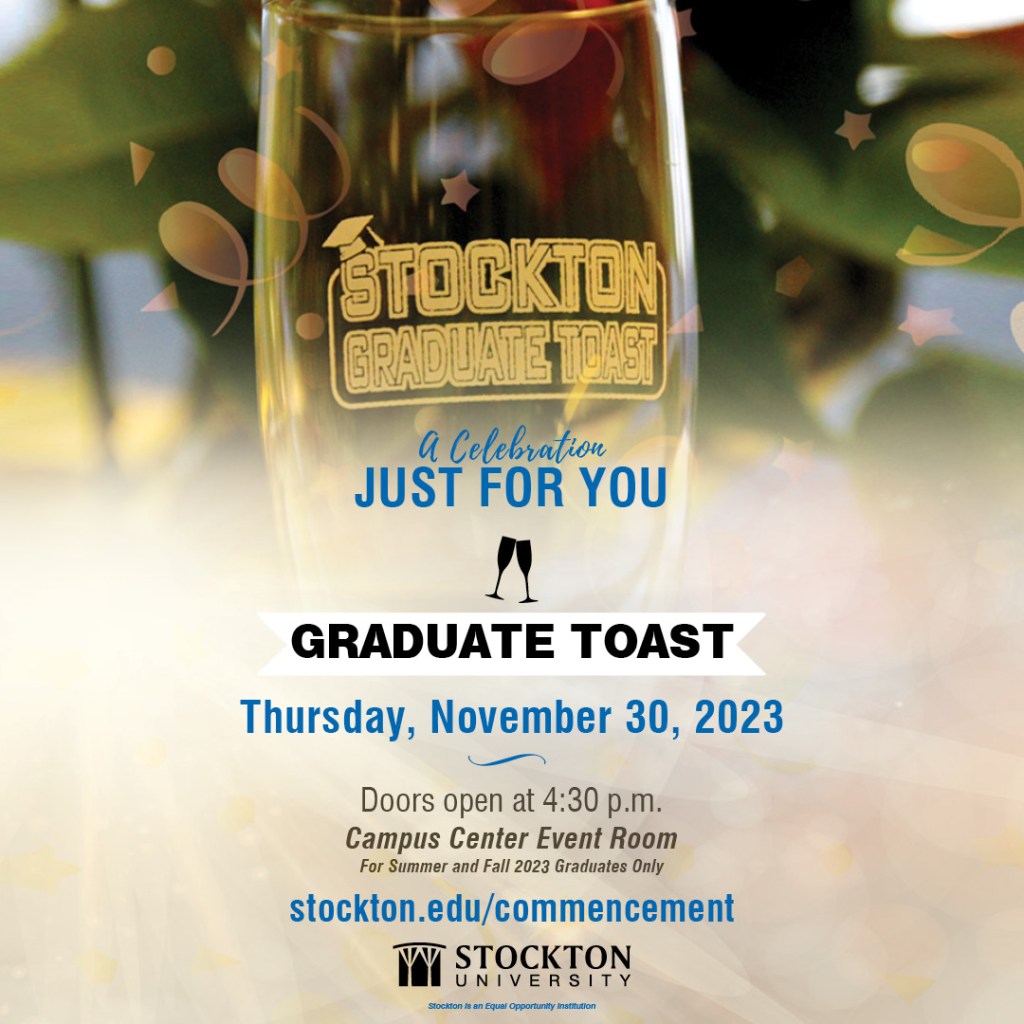 This November, Stockton University invites its Summer and Fall 2023 graduates to come and celebrate their accomplishments at the 2023 Graduate Toast, which will be held on Thursday, November 30, at 4:30 p.m. in the Campus Center Event Room.