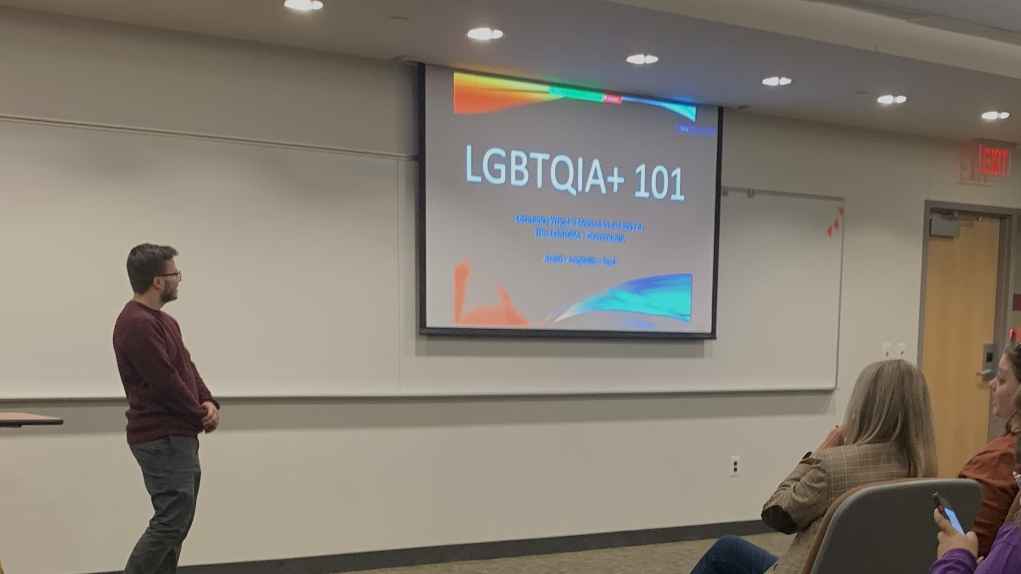 At the center of the night’s discussion was the idea of learning what it means to be part of the LGBTQIA+ community, and that there is not just one way to be a part of the community, but rather the experiences look different for everyone. The topics covered include things like what the letters LGBTQIA and beyond stand for, preferred terms, transitioning, and how to be an active ally. Dr. Angiollilo, PsyD, shared information both from his professional life and personal experiences to put together the presentation.