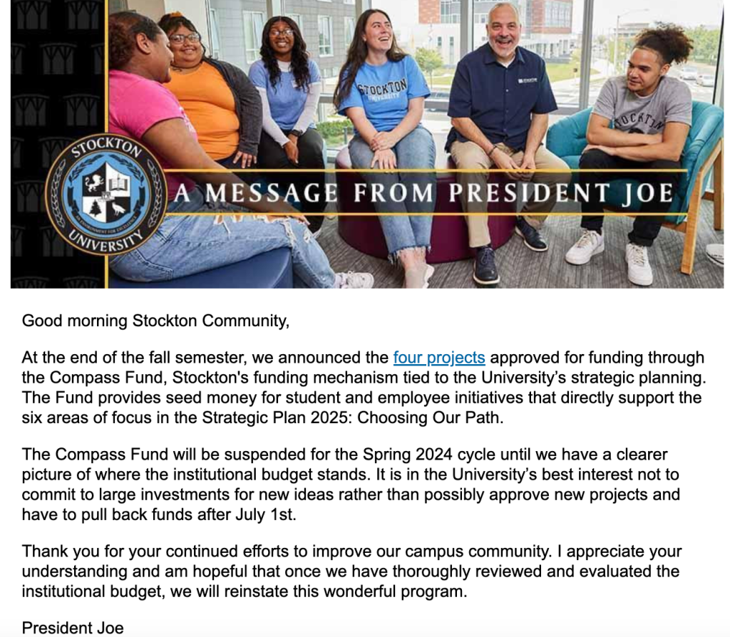 On Monday, January 22, 2024, Stockton University President Joe Bertolino announced via a mass email that the Compass Fund would be temporarily paused for the Spring 2024 Semester.