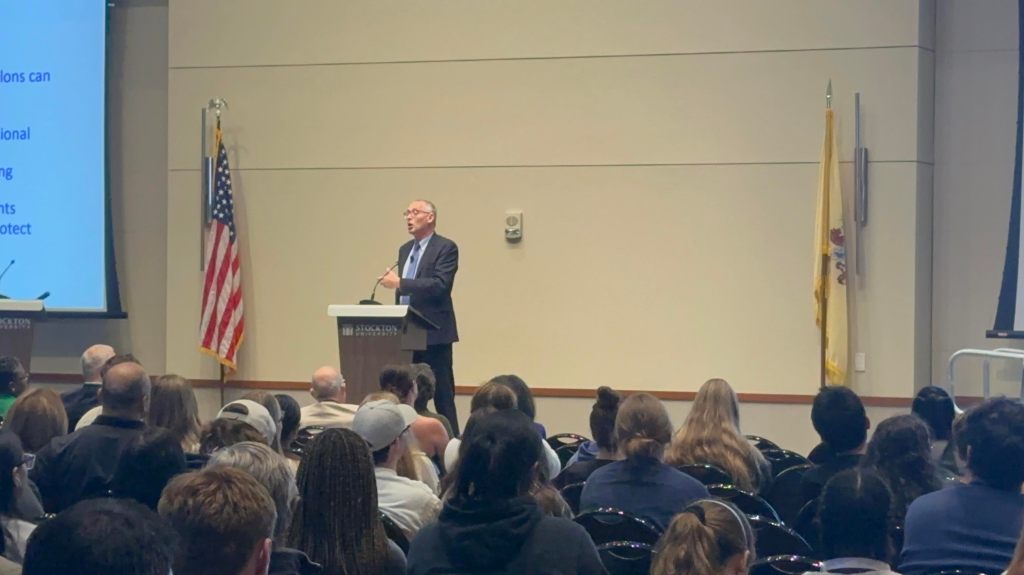 Before the event began, Professor Claire Abernathy made a few opening remarks about Constitution Day and thanked the Constitution Day committee with Associate Professors Lauren Balasco and Tina Zappile. It is important to note that this event was sponsored by the William J. Hughes Center for Public Policy and the American Democracy Project at Stockton, the Stockton University Foundation the University Advancement, and the Office of Provost. After the first opening remarks, President Joe Bertolino came up and introduced our keynote speaker and welcomed everyone to Stockton University’s 19th annual day and our keynote speaker.