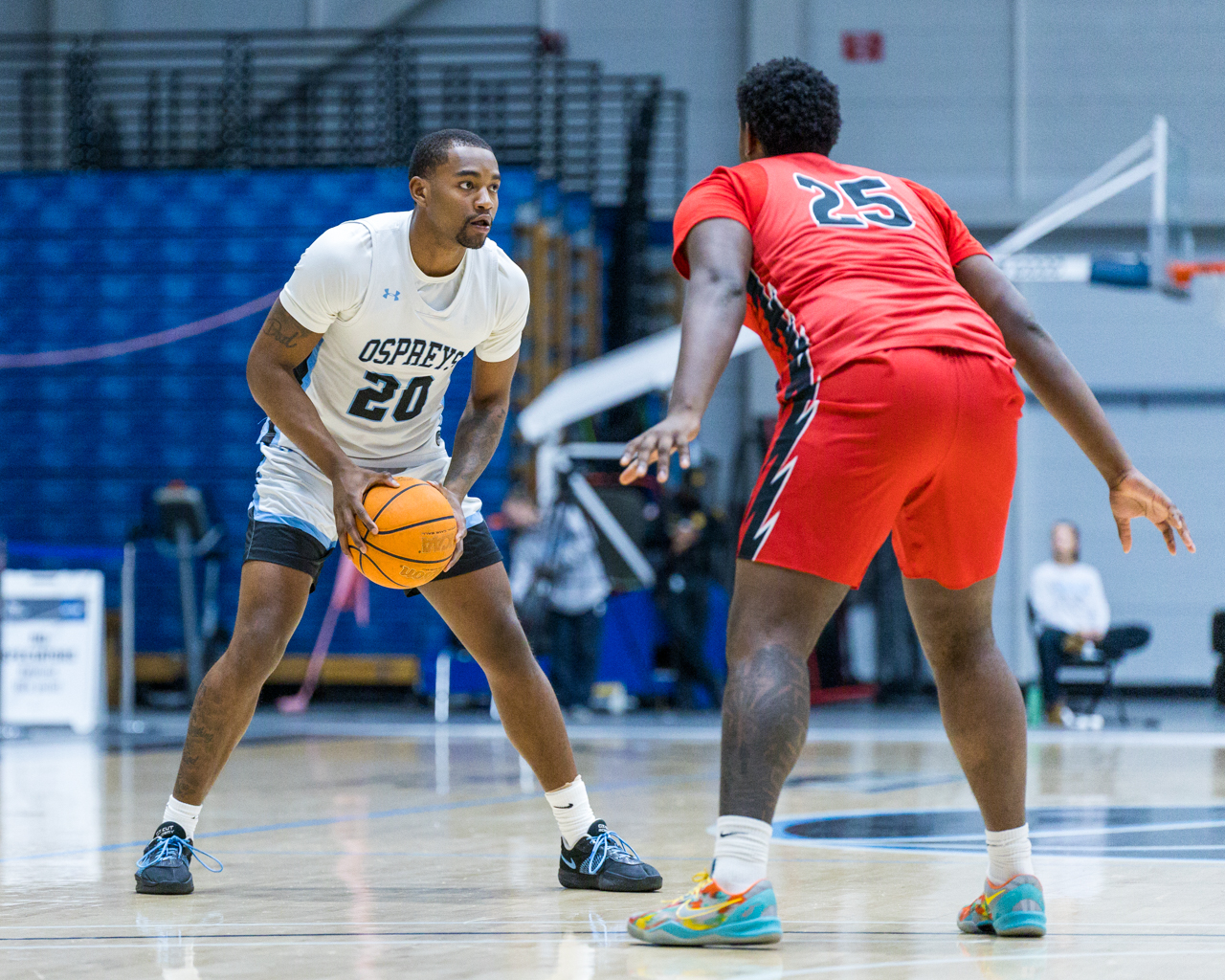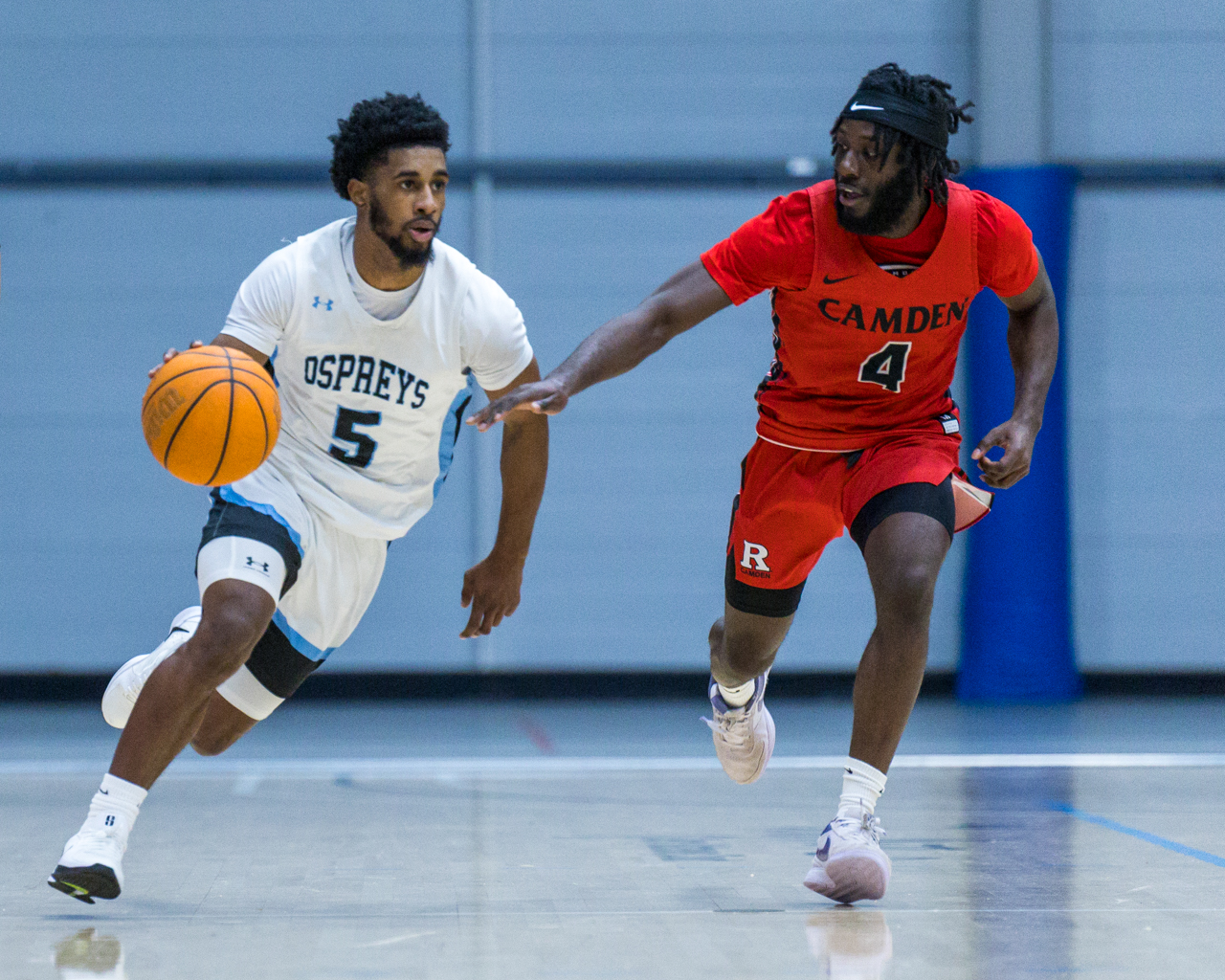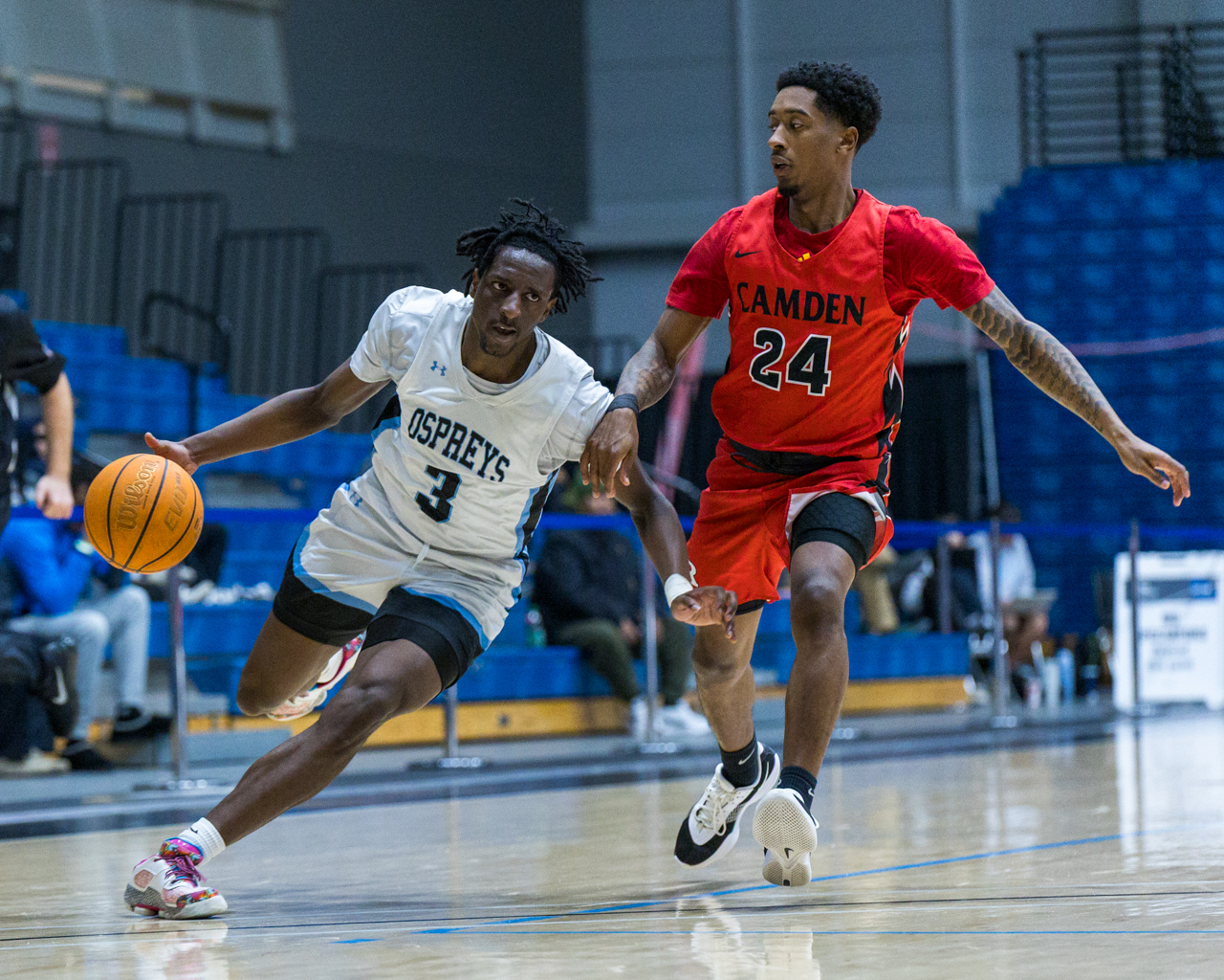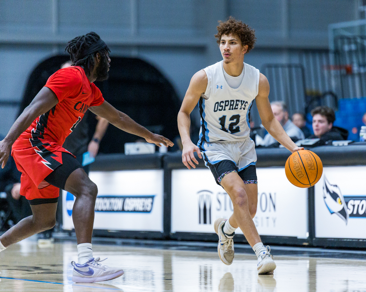 Junior Guard EJ Matthews-Spratley looks for an open player in a game against Rutgers-Camden on Thursday, Feb. 13 in Galloway, New Jersey. Photo courtesy of Sarah Kropinack.