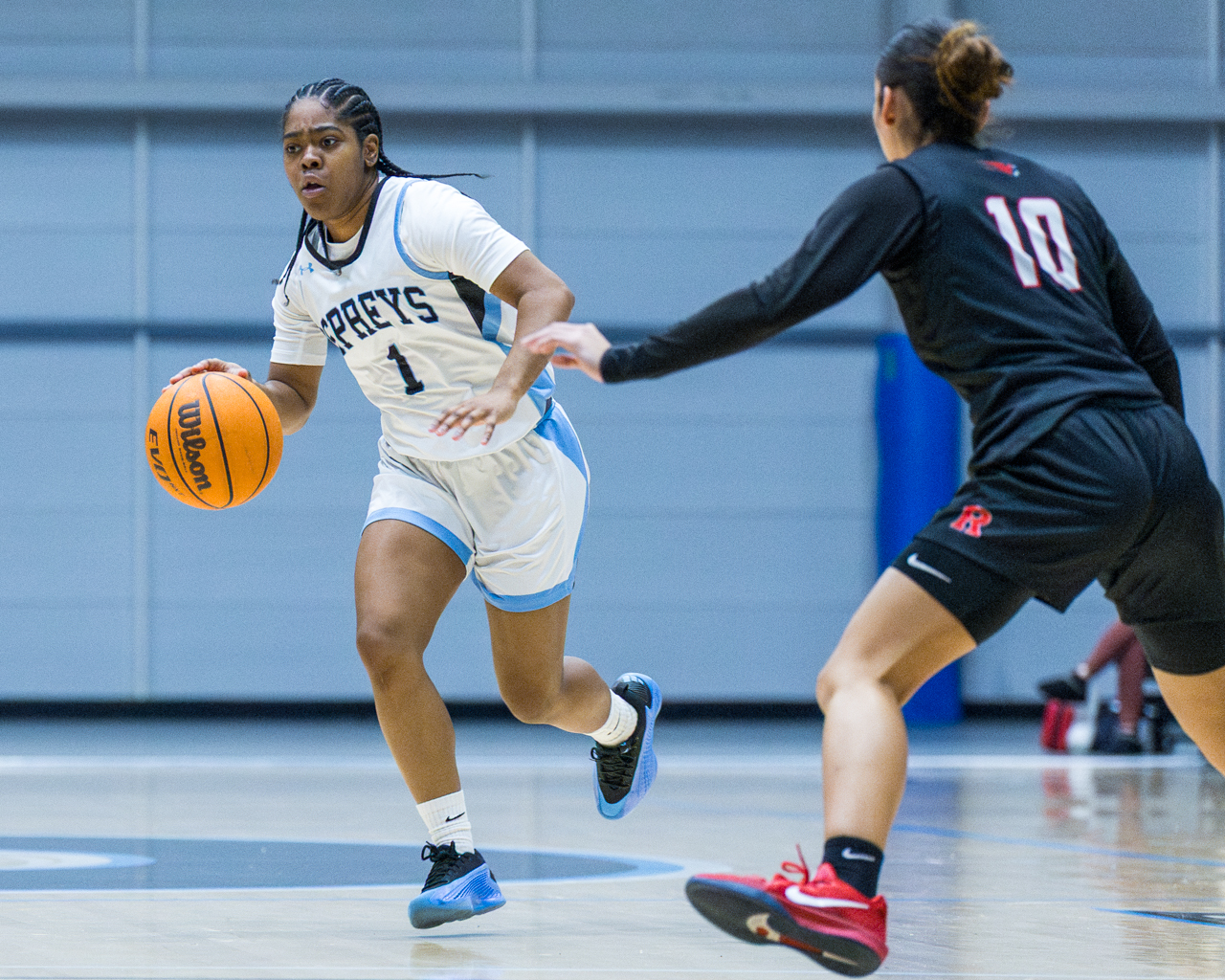 Brianna Robinson looks for an open player during a game against Rutgers-Camden on Thursday, Feb. 13 in Galloway, New Jersey. Photo courtesy of Sarah Kropinack.