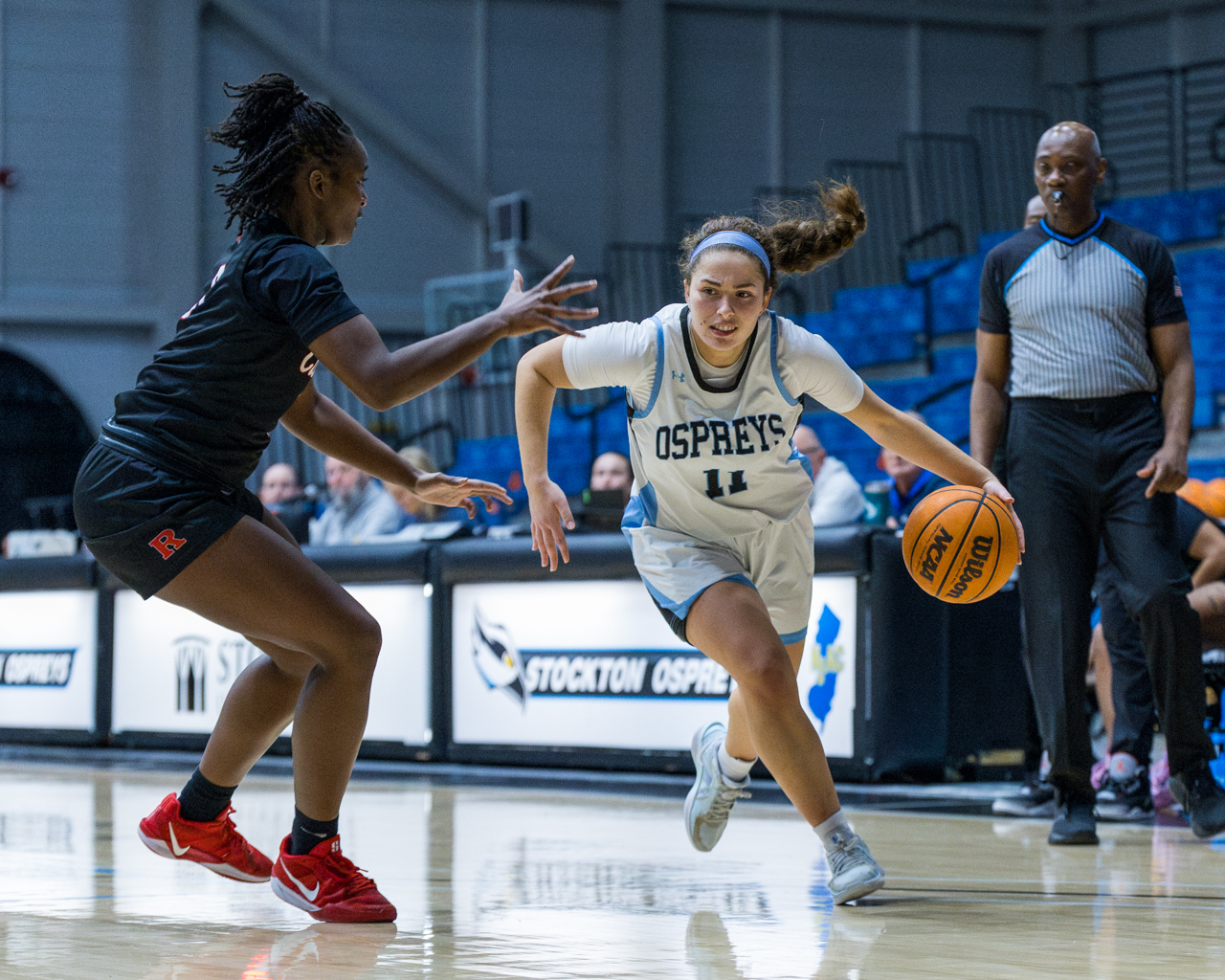 Sophomore Guard Joy LaCato pushes through Rutgers-Camden’s Defence during a game on Thursday, Feb. 13 in Galloway, New Jersey. Photo courtesy of Sarah Kropinack.