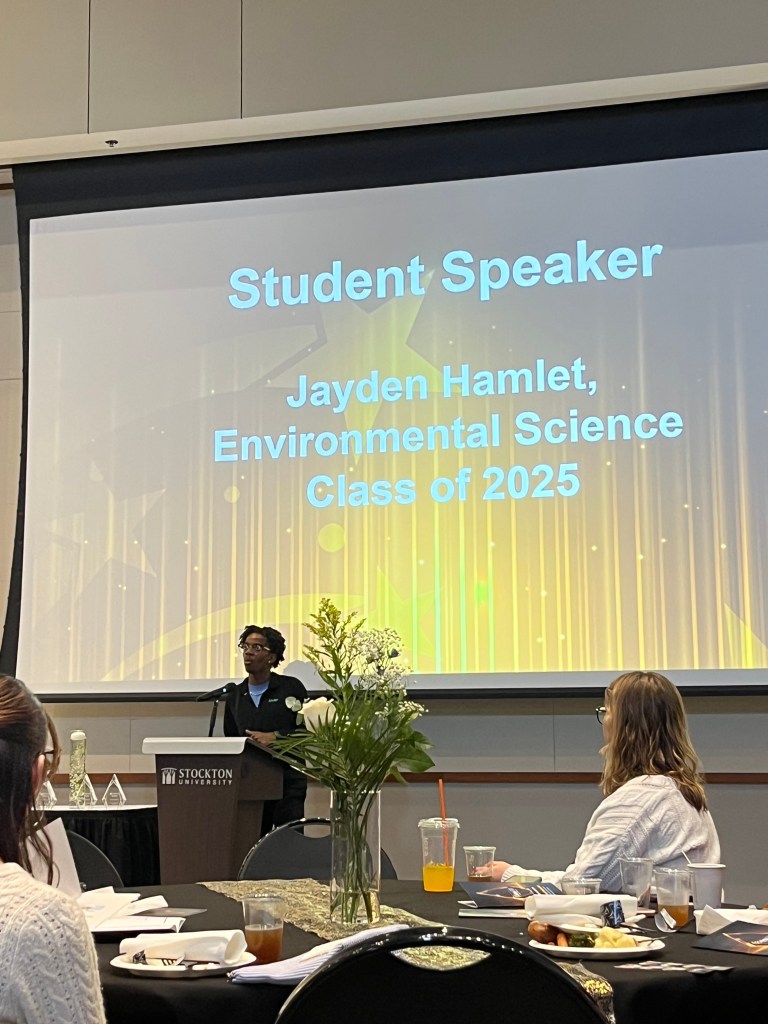 Graduating senior, Jaden Hamlet, who received award recognition on behalf of Sankofa—a student retention program for minority male students on campus—reflected on his journey to receive his Bachelor’s degree in Environmental Science. Hamlet shared, “My time at Stockton was not just a moment after a moment. It was a transition period.” This transition period he accredit to the various organizations on campus that kept him engaged and in a space of belonging.