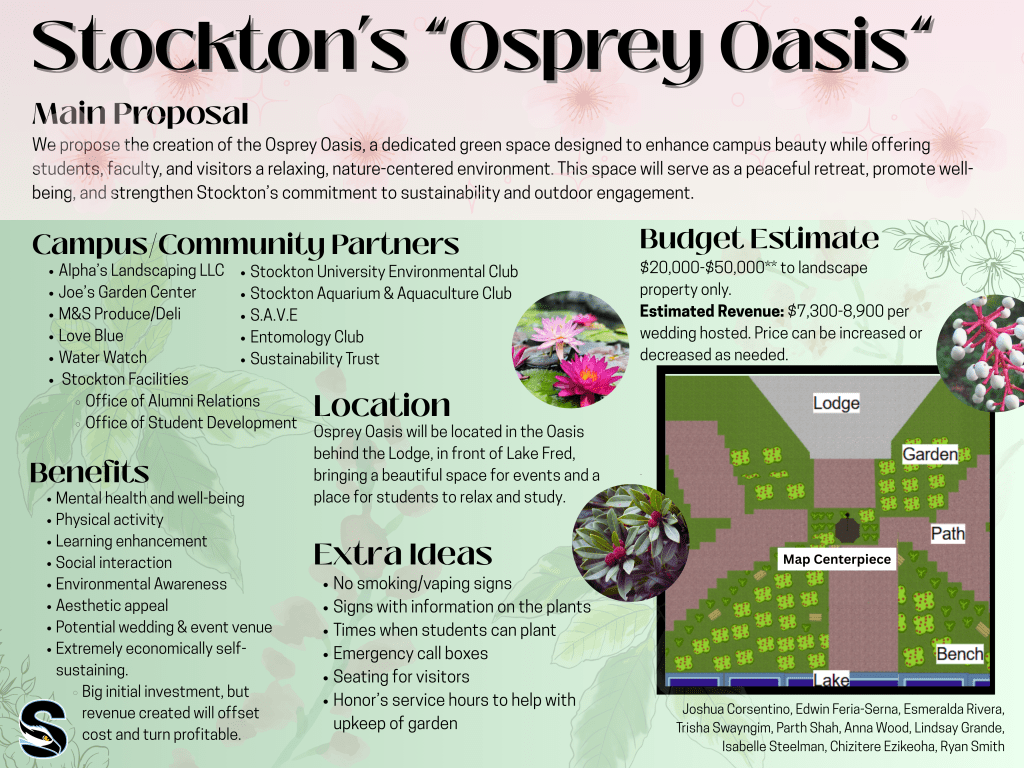 Edwin Feria-Serna, one of the Team Monday members and a member of the Honors College E-Board, is a very active and involved member of the Stockton community, also being part of Student Senate, EOF, and multiple cultural organizations. He stated that through these experiences, “I have seen, firsthand, the positive impact that thoughtful campus initiatives can have. I fully support the creation of Stockton’s ‘Botanical Oasis.’ I believe this green zone would greatly enhance the Stockton experience by providing a beautiful, calming space that promotes wellness, environmental stewardship, and campus pride. With my deep connection to the Stockton community, I am confident that this project will not only strengthen our campus environment, but also leave a lasting positive impact for future generations.”