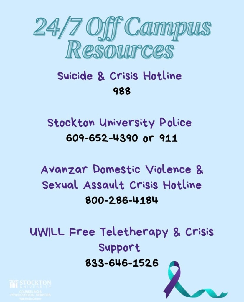 A list of off-campus mental health resources. Graphic courtesy of @Stocktonucaps Instagram.