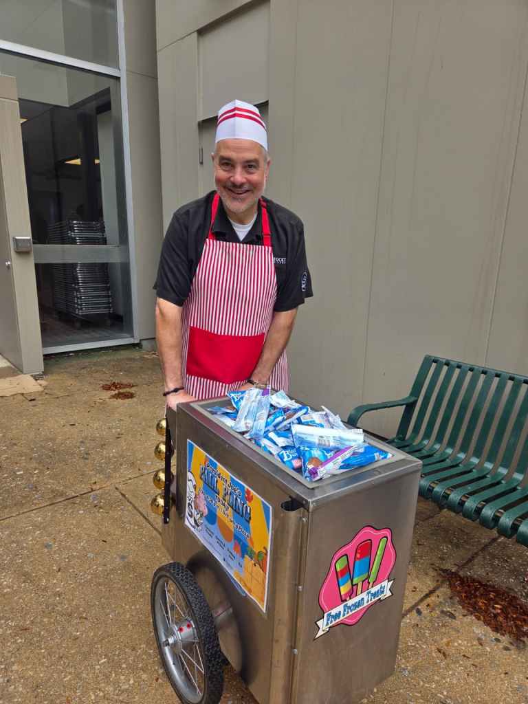 President Bertolino himself manned the ice cream cart, driving it all around campus to give students fudge bars and strawberry ice cream bars. Dressed in a pink-striped apron and a soda jerk cap, he rung bells and shouted, “Free ice cream!” to everyone in earshot.