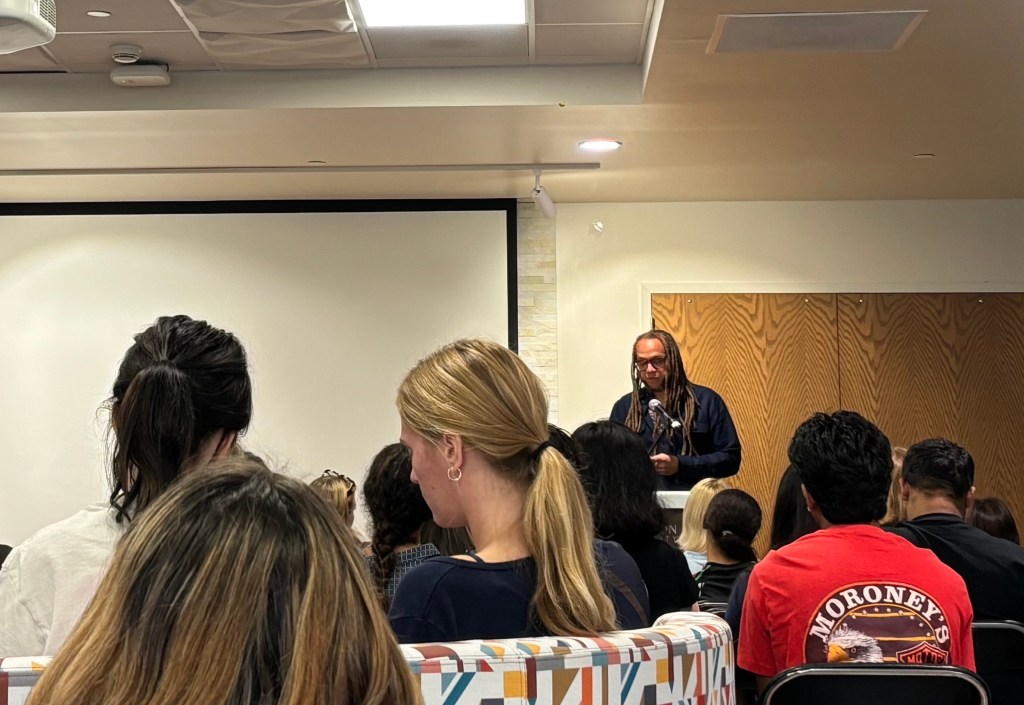 Recounting a memory that guided his writing philosophy after “Spit Back a Boy,” Pollock said, “My first book is a lot about being mixed race, I’m feeling between two cultures. I was like, how is this going to play for people that don’t have my experience? But I was at a reading in Box County, Pennsylvania, which is, as you probably know, it was a pretty rural part of Pennsylvania. And this student came up to me after the reading and was like, hey, your poems really resonated with me. I was like taken aback because […] demographically, I did not think we had much in common.”
