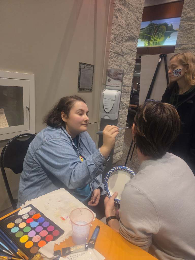 Aside from the festivities in the Event Room, the party was spilled outside to the Campus Center Grand Hall and Meeting Rooms. The Stockton College Panhellenic Council in association with Fraternity and Sorority Life had tie-dye tables set up with free white T-shirts and dye. A face-painting station and a photo shoot station were also available. Many of Stockton’s mental health resources as well as many recovery centers and mental health centers from off-campus tabled in the hallway, some offering games and prizes.