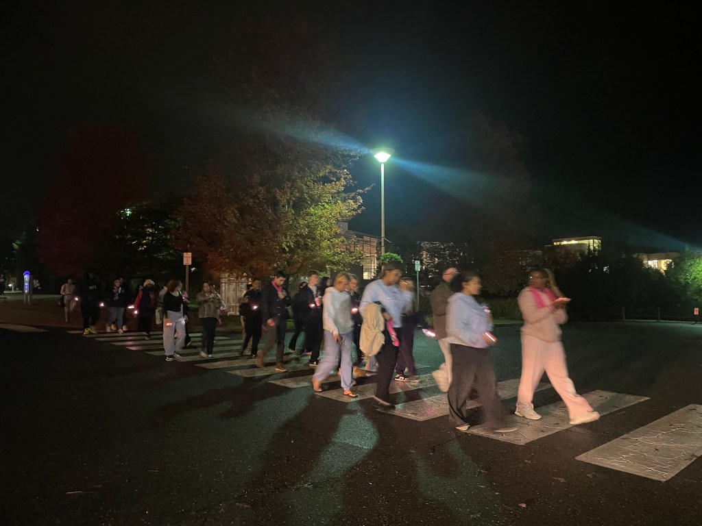The walk paused at the halfway point for a few statistics about breast cancer, shared by Hannah Binetsky, representing the First Ospreys, and Tony Guardado-Castro, representing the Zulu Chapter of Lambda Sigma Upsilon Latino Fraternity, Inc.