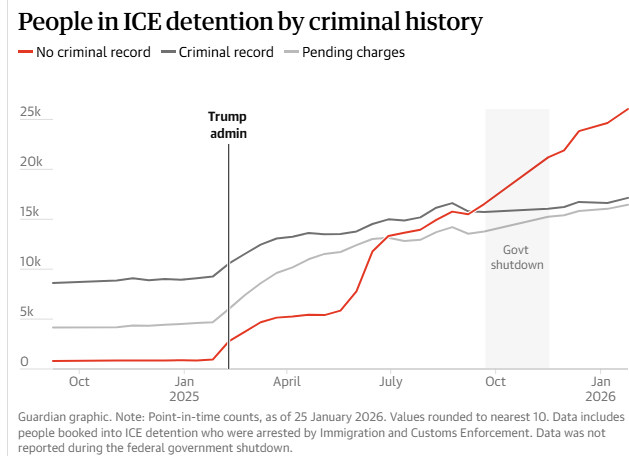 Amongst those most frightened are the immigrant community here at Stockton and those with immigrant friends and/or loved ones. An article published to The Guardian by José Olivares and Will Craft showed data that the majority of people in ICE custody have no criminal record.