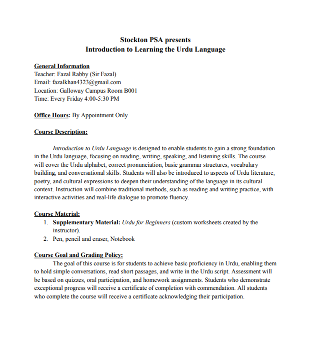 Language enthusiasts at Stockton have something new to look forward to this semester. What began as a simple idea among student leaders has grown into a cultural and educational initiative open to the entire community. The Pakistani Student Association (PSA) is now offering a free beginner-level Urdu language class every Friday from 4:00 P.M. to 5:30 P.M. in B001 on the Galloway campus.