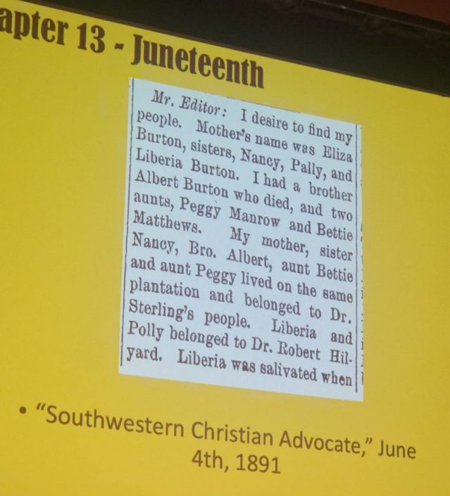 One of the chapters, titled “Juneteenth”, detailed a newspaper clipping from the Southwestern Christian Advocate, from the June 4 1891 issue, where Tempy had written a letter to the editor to find her relatives that were separated from her through slavery. “Being able to find something that my great-great-grandmother printed in the newspaper was really amazing. First of all, [being] one generation away from slavery: she was literate.”