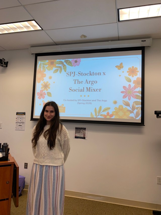 Mary Gallagher, a senior at Stockton University, the president of the SJP and a writer with The Argo, was the next speaker at the mixer. Gallagher wanted the students at the mixer to know that there are many ways one can go about the journalism field, and that it doesn’t always “just need to be a hobby.”