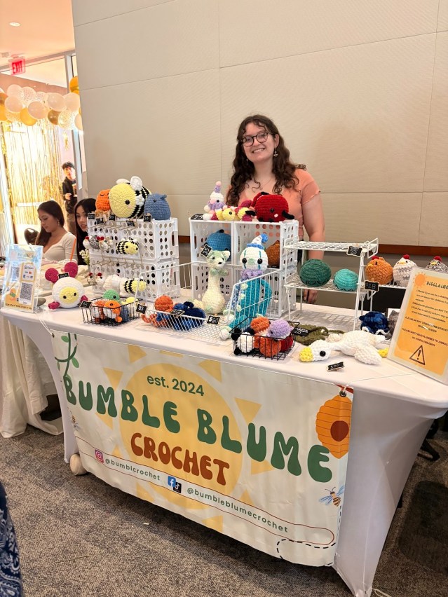 Right off the bat, guests were welcomed to a space with festive music and colorful decorations that transformed the event room. The front wall of the room was lined with student vendors—-including Studiocatco, Frigid, and Bumble Blume Crochet—-who were selling second hand clothes, handmade artwork, crochet plushies, and even student-run clothing brands.
