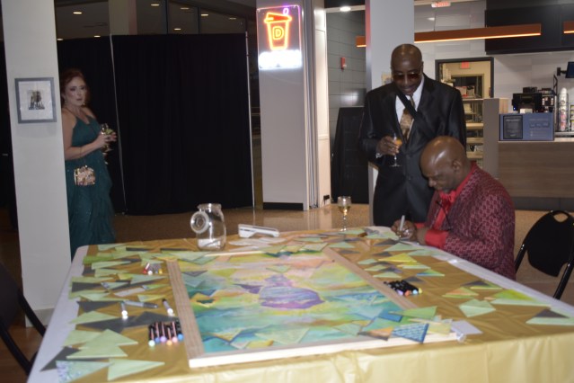 The Art & Music Café took the place of the Campus Center Coffeehouse. Here guests could enjoy live performances and poetry readings. For food, the section offered another of the multiple open bars available, a buffet, and a carving station where guests could enjoy pot roast. The highlight of this section however, was the student artwork display and the interactive mural activity. Professor of Art, Mariana Smith, described the interactive visual art activity, “it’s a mural, every triangle is a tree people can decorate and make a forest around Lake Fred”. All of the student art works on display were available for purchase.